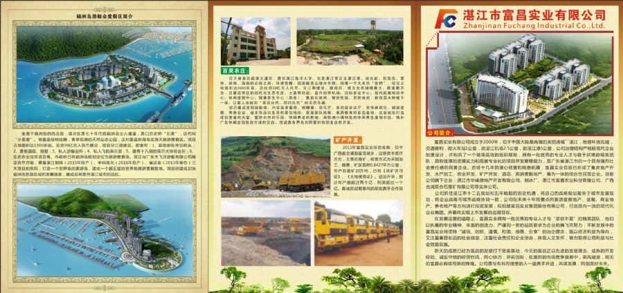 富昌實業(yè)位于中國大陸最南端的美麗港城——湛江,地理環(huán)境優(yōu)越,交通便利,距火車站1公里,距湛江機場2.5公里,距湛江港5公里,治理結構嚴格按現代企業(yè)制度設計,并構筑了一個精簡高效的組織框架,擁有一批優(yōu)秀的專業(yè)人才與敢于拼搏的精英團隊,具有雄厚的資源實力和高度專業(yè)化的項目開發(fā)管理能力,是廣東省湛江市的一個具有強烈社會責任感的民營企業(yè)。歷經十幾年的潛心經營和銳意拓展,富昌實業(yè)目前已形成了集房地產開發(fā)、水產加工、農業(yè)開發(fā)、礦產開發(fā)、酒店、旅游度假地產、等為一體的綜合性民營企業(yè)。旗下:湛江市華峰房地產開發(fā)、制冰廠、湛江市富盛農業(yè)科技、廣西合浦雙合石膏礦等實體。